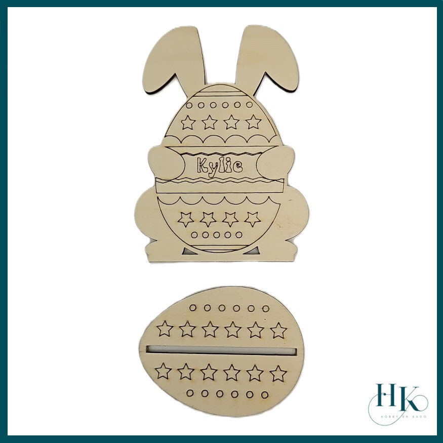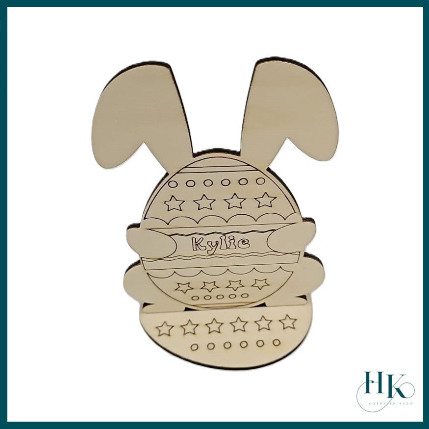 Op dit leuke knutselei kunt u uw eigen naam laten graveren. Het ei met bijbehorend eivormig voetje kunt u leuk inkleuren met een viltstift of met verf.