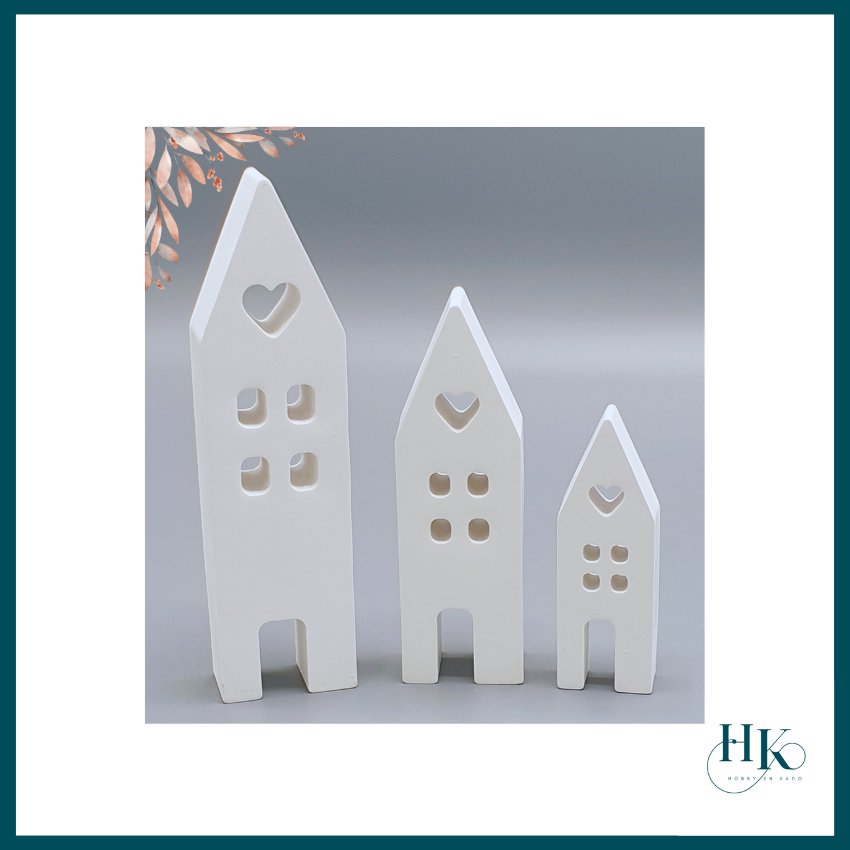 Afmetingen: groot huisje H 15 cm x br 4 cm, midden huisje H 11,5 cm x br 3,5 cm, klein huisje H 5,5 cm x br 2,5 cm