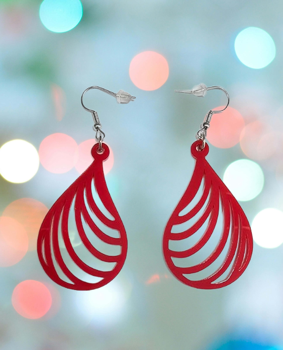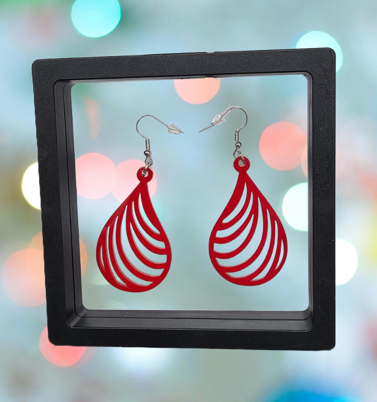 Oorbellen van rood plexiglas in de vorm van een open druppel in een mooi doosje.
