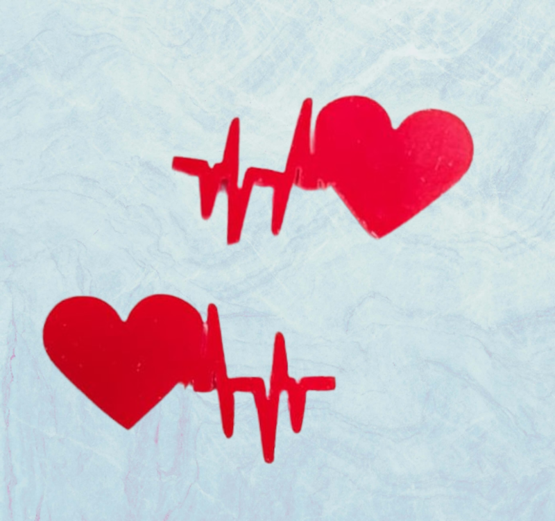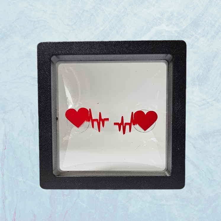 Oorstekers met hart en sinusritme rood plexiglas. In een mooi doosje. Met siliconen oorstoppers.